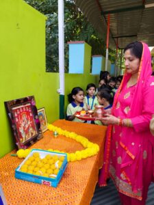 The celebration begins with Dhanteras, which marks the start of the festive week. On this day, we worship Lord Dhanvantari, the God of health, and Goddess Lakshmi for prosperity. At Sanskaar Bharti Public School, students learn about the importance of good health and hard work as true wealth. Teachers explain how this day reminds us that health and knowledge are our greatest treasures. Students also decorate classrooms with diyas and rangoli, spreading positivity all around.